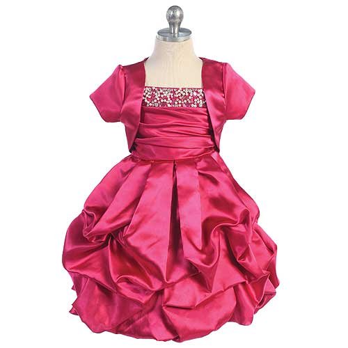 A gorgeous Christmas or special occasion dress for your little girl by Chic Baby. A beautiful dress with a hand made beaded banded top to complement the entire draped layered, bubble dress. Short sleeve bolero jacket makes this dress a vision to behold. The perfect dress for any special occasion. Comes in your choice of fuchsia, ivory, lime green, purple, turquoise or white.