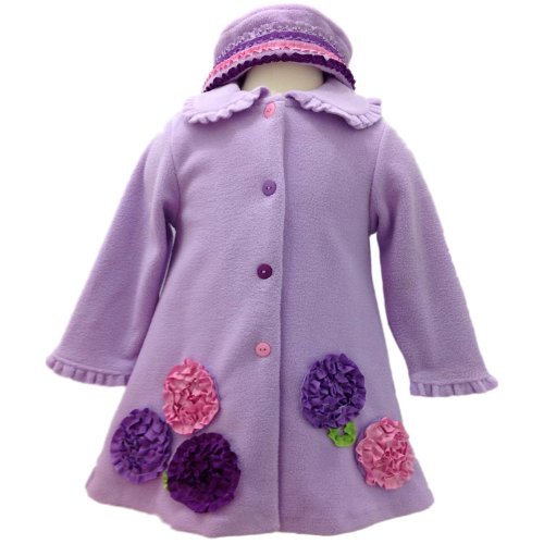 - LAVENDER-PURPLE FLEECE COAT & HAT SET features PINK & PURPLE BONAZ FLOWER DETAILS with RUFFLE TRIM at the LONG SLEEVES & PETER PAN COLLAR and SNAP BUTTON CLOSURE hidden behind NOVELTY PINK & PURPLE BUTTONS.