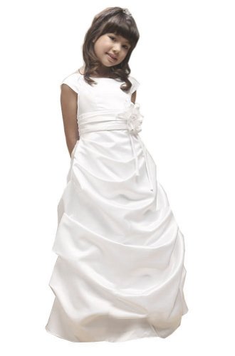 New Sophisticated Satiny Floor Length Dress ... Perfect for Flower Girls or First Holy Communion; Matte Satiny Bodice with Tiny Cap Over Sleeves; Wide Pleated Sash with Detachable Rose Flower; Wavy Pick-Up Floor Length Style Skirt; 70% Polyester 30% Acetate; Hand Wash; Made in USA