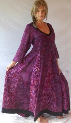 This dress is designed with ingenious insets in the skirt that provide a wonderful renaissance style and at the same time create a comfortable fullness that attractively follows the figure without tightness or restriction. Not only that, they create a vertical visual effect that is very slenderizing. The princess neckline, empire waist, 3/4 sleeves, and a back tie that allows you to fit to your individual figure add to the appeal of the dress. This is done up in really beautiful contrasting rayon batiks that have a lovely drape and flow. Multi-seasonal, comfortable and very flattering, this is a dress that's easy to love.