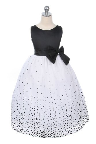 Striking Combinations of Colors Make This Style Shine. New Two Tone Dotted Pageant Flower Girl Dress in Choice of Fuchsia & Pink or Black & White; Sleeveless Taffeta Bodice with Non-Removable Tied Bow at Waistline; Layered Tea Length Mesh Skirt with Flocked Cascading Polka Dots; Back Zippered Closure with Tie Bow Sash for Customized Fit at Waist; Size Chart - Click on the link beneath the main product image to view the size chart for this specific style.