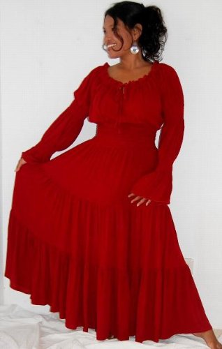 This dress is THE style of the season. It's a Mexican peasant style originally popularized by artist Frida Kahlo, who celebrated everything 'Mexican,' and brought traditional Mexican costume to New York, looking so fabulous that the style became popular. See her and her costumes in the movie, "Frida."This Mexican peasant dress fits itself to your figure as opposed to you fitting (or forcing) yourself to it. And it does it in a very flattering way. Designed with a smocked waist that fits to you with yet more options for fit with a drawstring tie, a full bodice with an elasticized and ruffled neckline that you can wear on your shoulders or be a tad daring and wear it off-shoulder, a long, full, tiered skirt, and long elasticized sleeves. The bodice has a drawstring tie so that you can adjust the fit and degree of openness.The fabric used for these is a crinkle rayon that's cool for summer, feels great against the skin, drapes and flows beautifully, and accepts dyes well for rich, saturated coloring. Try wearing this with one of our silk pashmina shawls draped around your shoulders; you're going to be nothing short of gorgeous in this.