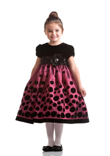 The Detailed Description of Trista Short Sleeve Polka Dot Holiday Dress with Flower Sash for Girls Fancy Dress Color: Magenta Dress Size: Size 9-10Features
