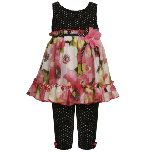 - BLACK/PINK MULTI FLORAL PRINT CHIFFON & KNIT DRESS & LEGGING SET features sleeveless TUNIC-DRESS with BLACK/WHITE PIN DOT KNIT BODICE and PINK/MULTI FLORAL PRINT CHIFFON OVERLAY SKIRT with RUFFLE HEM and SPARKLNG JEWEL-CENTER FLOWER APPLIQUE ACCENT AT THE GATHERED PAPER-BAG WAIST plus GROSGRAIN RIBBON BOW TIE SASH IN BACK.