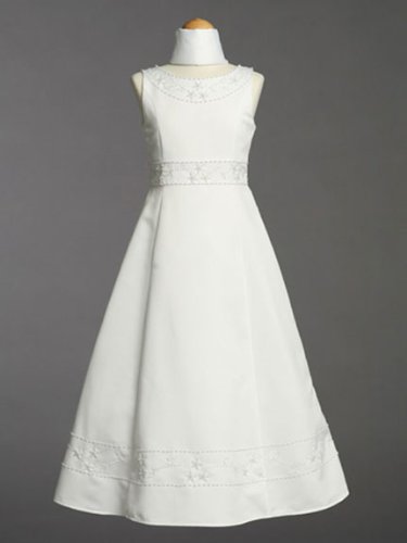 Satin Communion dress is sleeveless with elegant bead accents. Dress comes with a shawl and the skirt is tea length.