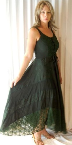 This is the perfect dress for those occasions where you want to look extra extra special; you know, a 'first' date, or meeting the former girlfriend, or having lunch with old friends, etc. This will do the trick, and you won't strain your budget or your comfort level doing it.Designed with a sweetheart neckline, straps that are just wide enough to cover your bra, a lacy bodice with flattering 'princess' seams and adjustable lacing ties, and a skirt that's patched in a scallop pattern, alternating silky, satiny and semi-sheer lacy fabrics. The form of this dress floats lightly over the figure without restriction, to create a very slimming yet easy to wear silhouette.The very, very elegant fabrics for this include a silky, semi-sheer rayon georgette, satiny rayon jacquard, and a semi-sheer lace. The textural contrasts and the draping characteristics for this dress are astonishingly wonderful.This really is an extra extra special dress that you'll treasure for its' figure-flattering elegance and sensuous charm. Available in several especially luscious color options, one of which will be extra extra perfect for you.