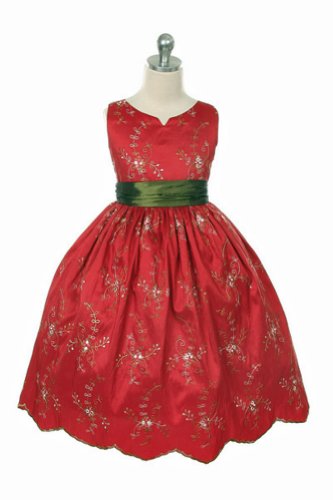 New Heirloom Style Red & Olive Green Christmas Holiday Dress. Fantastic Petite Flower & Vine Embroidered on Light Weight Red Taffeta. Contrasting Olive Green Waist Sash and Tea Length Skirt.