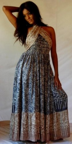 This breath-taking new style is sure to transform you into the belle of the ball! It's sexy, sophisticated and exceptionally flattering. And so comfortably easy-to-wear that you'll be able to enjoy all the compliments heading your way!The halter neckline slips over the head crosses over and twists at the bust, then splays out and wraps around to create a sexy and supportive bodice with an open back. The skirt flows down in a sweeping a-line form, concluding with a deep ruffle at the hem.Made up in a compatible combination of some of the world's finest Balinese batiks. The drape and flow factor with these delightfully silky fabrics is exceptional. The colors bright, rich and festive and the batik prints arty and unique.Enjoy all the admiring compliments you'll receive as well as the carefree comfort you'll experience in this artsy, sexy new style. Annie's created a winner here.