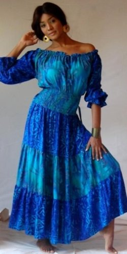 There are dresses and then there are dresses. This is one of the very special ones. Designed as a classic Mexican-inspired peasant dress, this has a ruffled, elasticized neckline with front vent and drawstring; you can wear it on your shoulders to create a scoop neck or, if the occasion warrants it, wear it off-shoulder and watch the little beads of sweat build up on his brow, 3/4 sleeves. The waist is defined by a broad swath of elasticized smocking followed by three gloriously full and gathered tiers of fabric for the skirt.Done up in a batik rayon, a great drape and flow and a soft feel next to the skin. The rich and luscious color options are designed to flatter all skin tones.One of the most ancient art objects ever discovered is the iconic "Venus of Willendorf,' a small, 4-inch stone figurine estimated to have been carved around 32,000 BC. She REALLY has curves. And people worshipped her.Celebrate your own unique 'Venus' in this very special dress. It translates your every swoop, sway and curve into the most feminine of forms. There's nothing more charming, nothing as alluring. Never doubt the magnificence of your own absolute beauty.