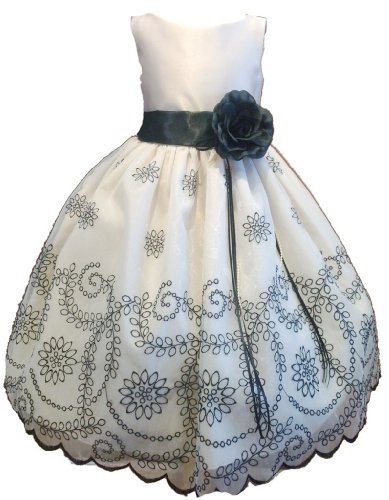 A great formal style party dress for little girls! The poly satin champagne dress has an organza overlay with black embroidered detailing. The skirt has a light petticoat and it is fully lined. Perfect for any formal event.