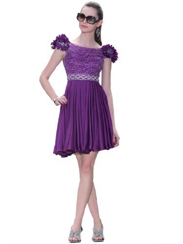 This is an astonishing ensemble for a modern lady who is going to attend to a party. Silhouetted in flawless A-line, this short party dress would give you comfort and shape a perfect figure for you. Lace overlaid bodice highlights a feminine look, yet the flowers accented to each shoulder adds some sweetness. Dazzling rhinestone waistline in the front finishes it with a glistening look.