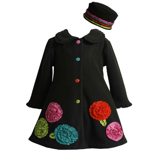 - BLACK FLEECE COAT & HAT SET features MULTICOLOR BONAZ FLOWER DETAILS with RUFFLE TRIM at the LONG SLEEVES & PETER PAN COLLAR and SNAP BUTTON CLOSURE hidden behind NOVELTY MULTICOLOR BUTTONS.